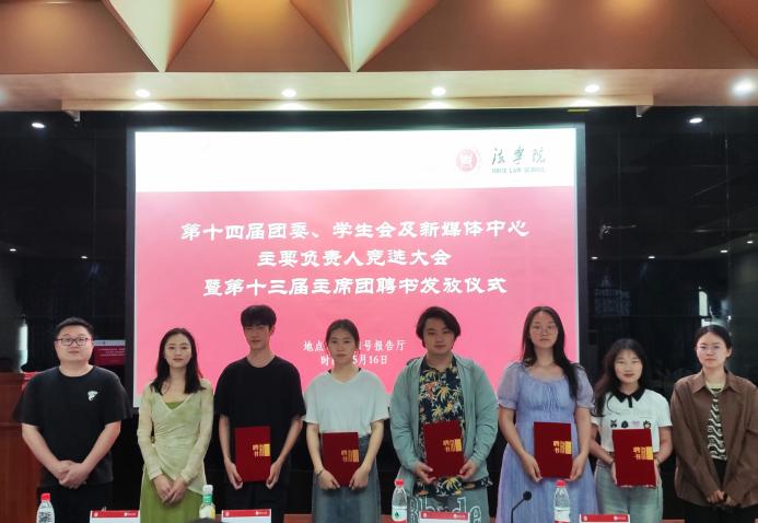 第十三届学生会主席丁桓宇代表学生会向学院同学做工作述职报告,学生会主席团各负责人依次做工作述职报告。司马子鸣、叶雅安、唐亚辉为学生会主席团成员颁发聘书。