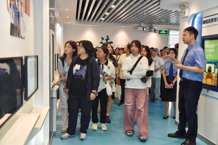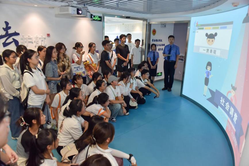 同学们在区检察官的带领下,参观了案件管理服务大厅和听证室,亲眼见证了检察工作的严谨与规范,对案件管理流程有了初步的了解。接下来一行人来到青少年法治教育基地,通过生动的展览和互动体验,同学们深刻感受到法治教育对于青少年成长的重要性。随后,参与者们又参观了一楼的本地办案区、远程提讯室以及远程庭审室。这些现代化的办案设施让大家眼前一亮,也深刻体会到了科技在检察工作中的广泛应用。在七楼的鼎尚书院,同学们聆听了一场关于“认识新型毒品,远离新型毒品”的专题讲座。检察官详细讲解了新型毒品的种类、危害以及防范措施,让大家对毒品问题有了更深入的了解。