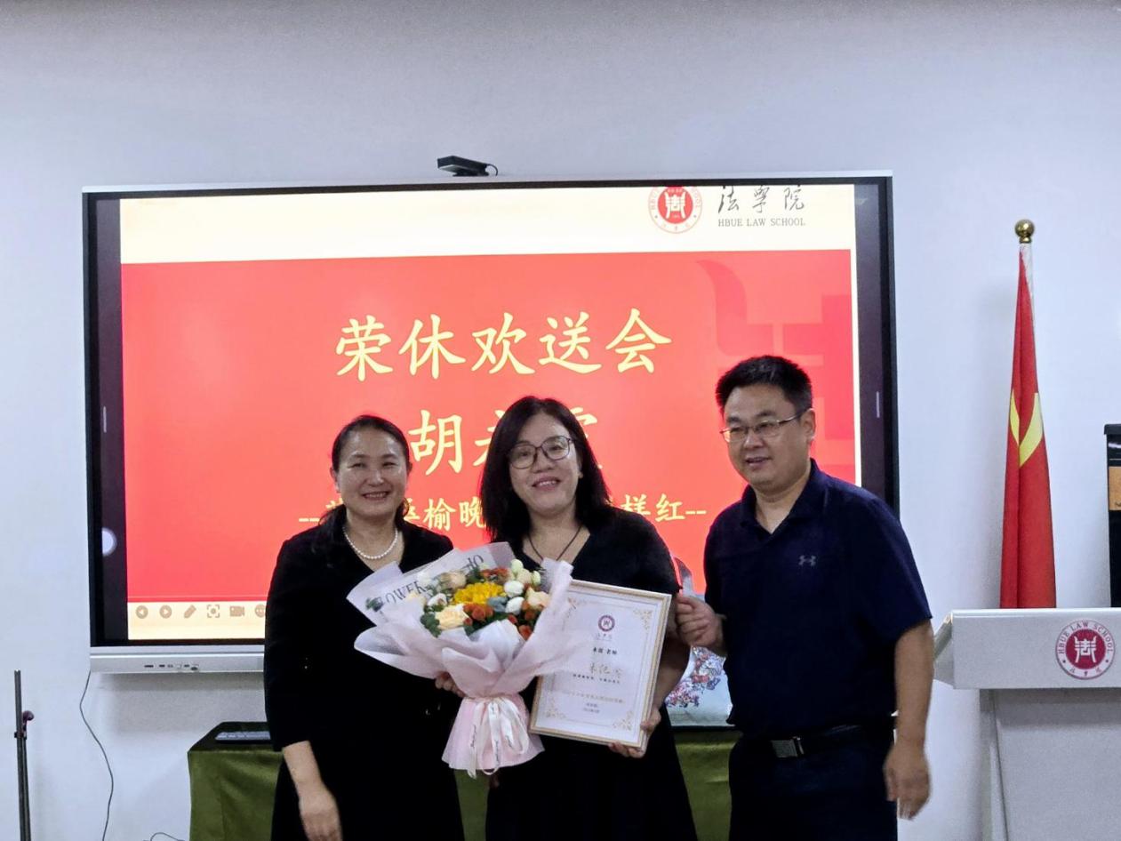 (杨专书记、邱秋院长向胡永霞老师献花、颁发荣休证书)