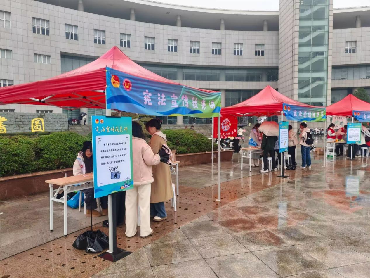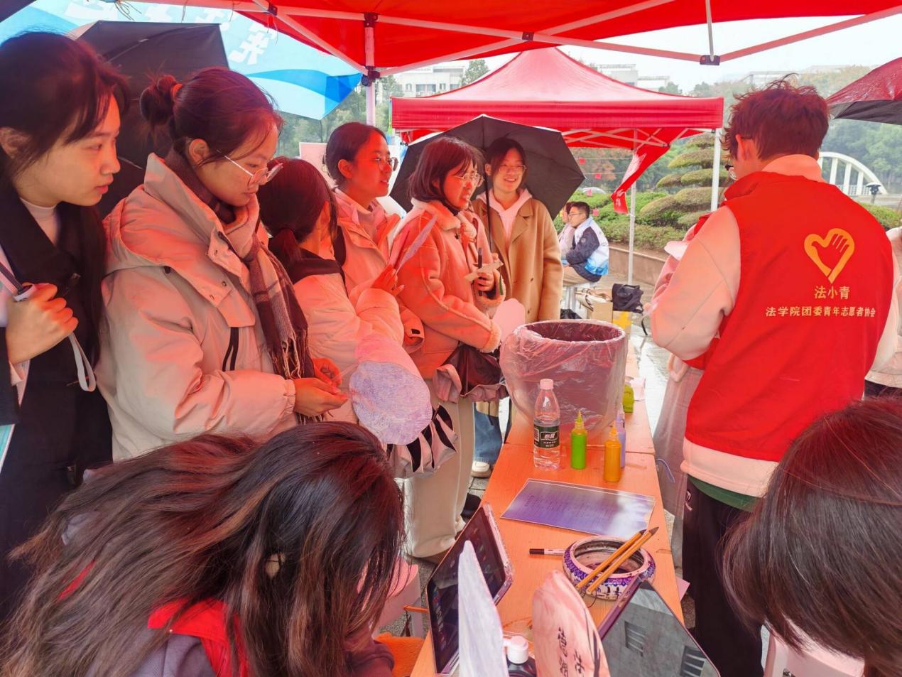 “法遇非遗,‘经’彩传承”普法集市共设立立五个摊位,采用游戏大闯关的方式将中华优秀传统文化与宪法宣传有机结合,加强宪法宣传的趣味性。在“宪法知识大挑战”摊位中,宪法灯谜悬挂你我猜,划拨算盘宪法数字大家答,持剑投壶宪法知识从心来,大家在游戏的乐趣中牢记宪法小知识。在“宪法法条大闯关”摊位上,法条排序头脑风暴正激烈,落叶为纸手书宪法,在快与慢的交错下学习宪法条文。在“宪法宣传我来讲”的摊位上,拿起手机,参与者字正腔圆录制起了宪法宣传视频,让宪法日的活动氛围传遍校园。在“宪法感悟我来写”的摊位上,一张张卡片是参与者对宪法的认识,从中我们可以看到宪法观念深深影响着我们生活的方方面面。闯完前四个摊位后,就可以集齐“经”“彩“呈”“宪”四张卡片到“宪法主题非遗漆扇制作”摊位上参与非遗漆扇制作,领取精美礼品了。活动现场,社团负责人孙马晓龙还向各位领导详细介绍了活动的内容与特色,同时他们也积极参与到我们的活动中来,最后志愿者们向领导们赠送漆扇以表示我们的感谢。