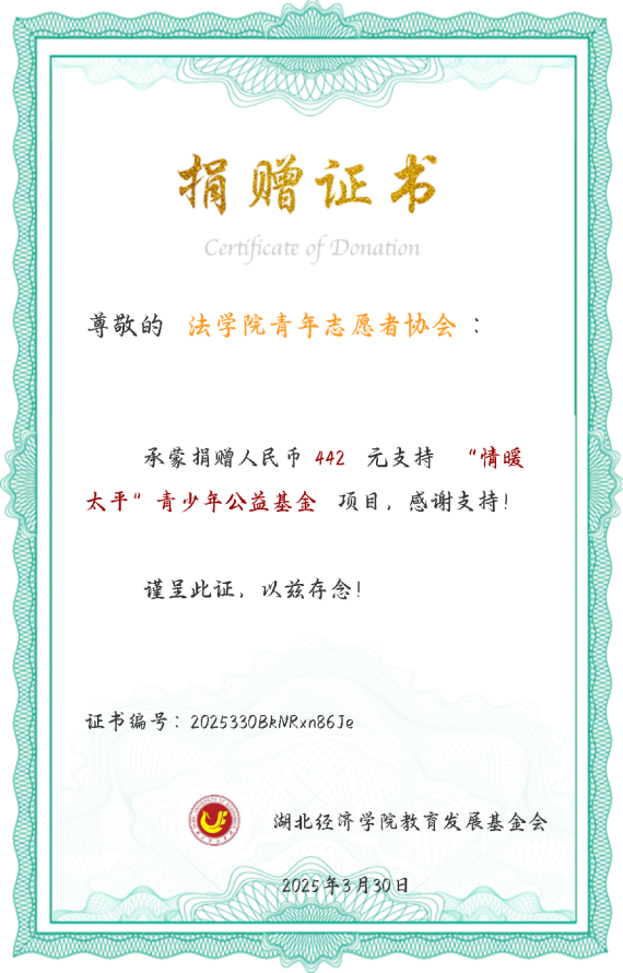 本网讯(通讯员:尹子涵,审核人:司马子鸣)3月30日,开云青年志愿者协会在樱花市集的“樱”为有你,“漆”望同行为主题的漆扇公益义卖活动圆满结束。活动结束后,志愿者们将义卖所得除去合理费用后的善款共计人民币1400元,分两批捐赠至“情暖太平”青少年公益基金,开云kaiyun官方网站教育发展基金会为协会颁发了捐赠证书以兹纪念。