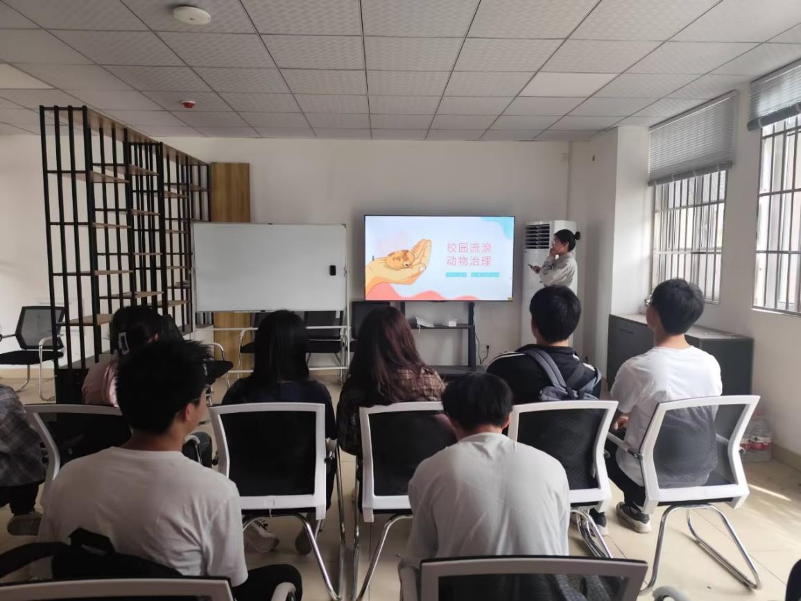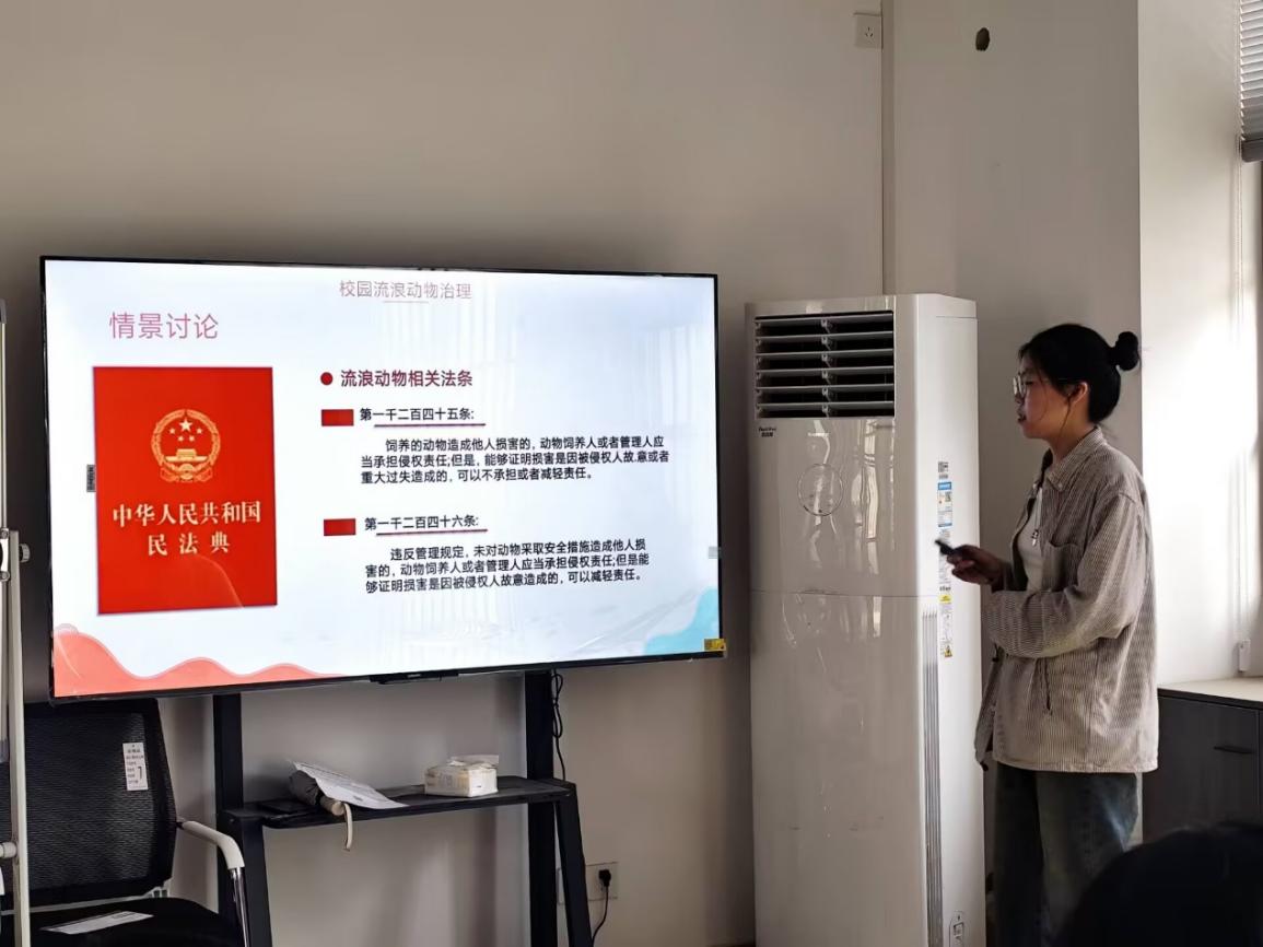 法学2343班的杨涵同学担任主讲人,她以“校园流浪动物治理”为切入点,结合丰富案例与相关法律条文,深入剖析背后法理,为同学们带来了一场精彩的法治实践课。