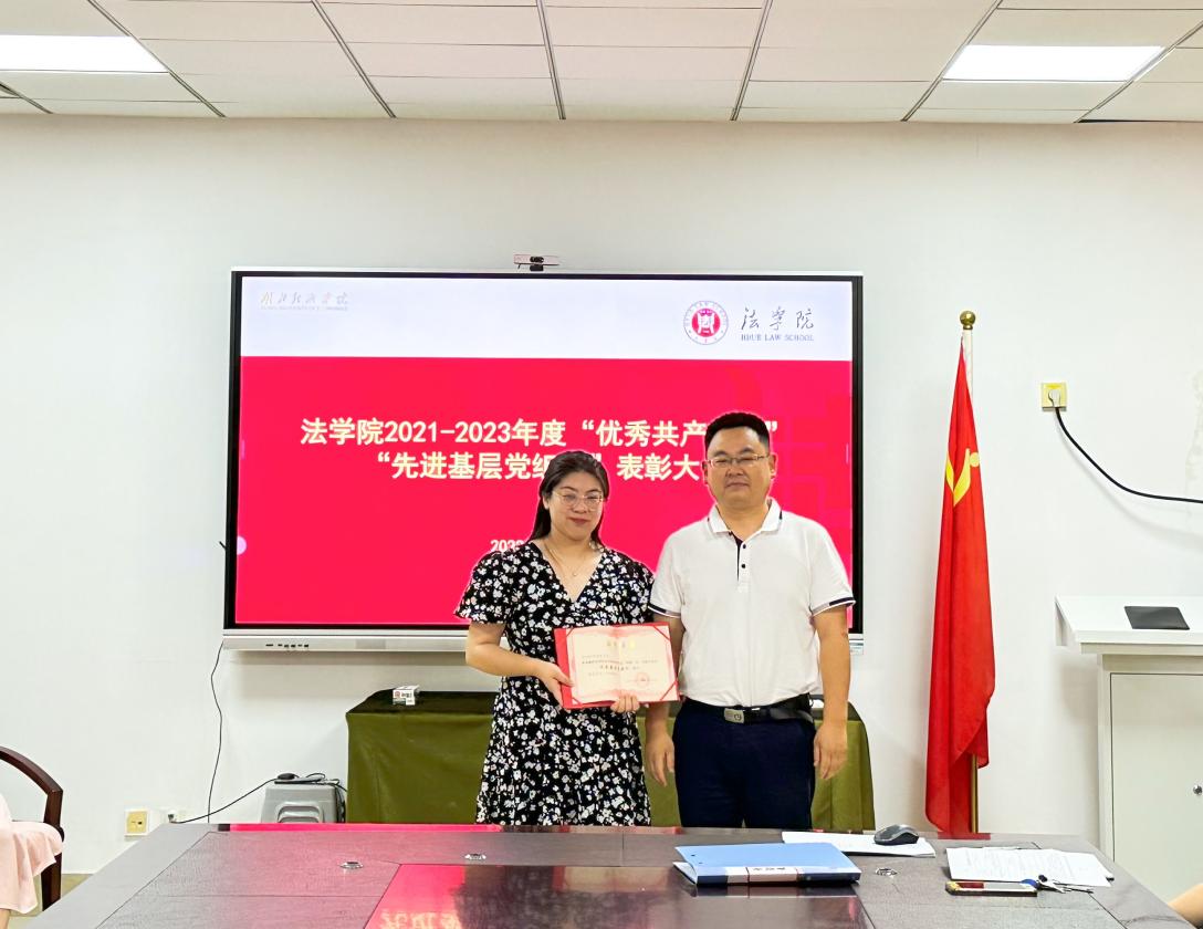 黎桦宣读《开云kaiyun官方网站关于表彰2021-2023年度优秀共产党员和先进基层党组织的决定》,授予汤建辉、何再涛、严念慈三位同志为“优秀共产党员”,授予经济法学系党支部为“先进基层党组织”荣誉称号。