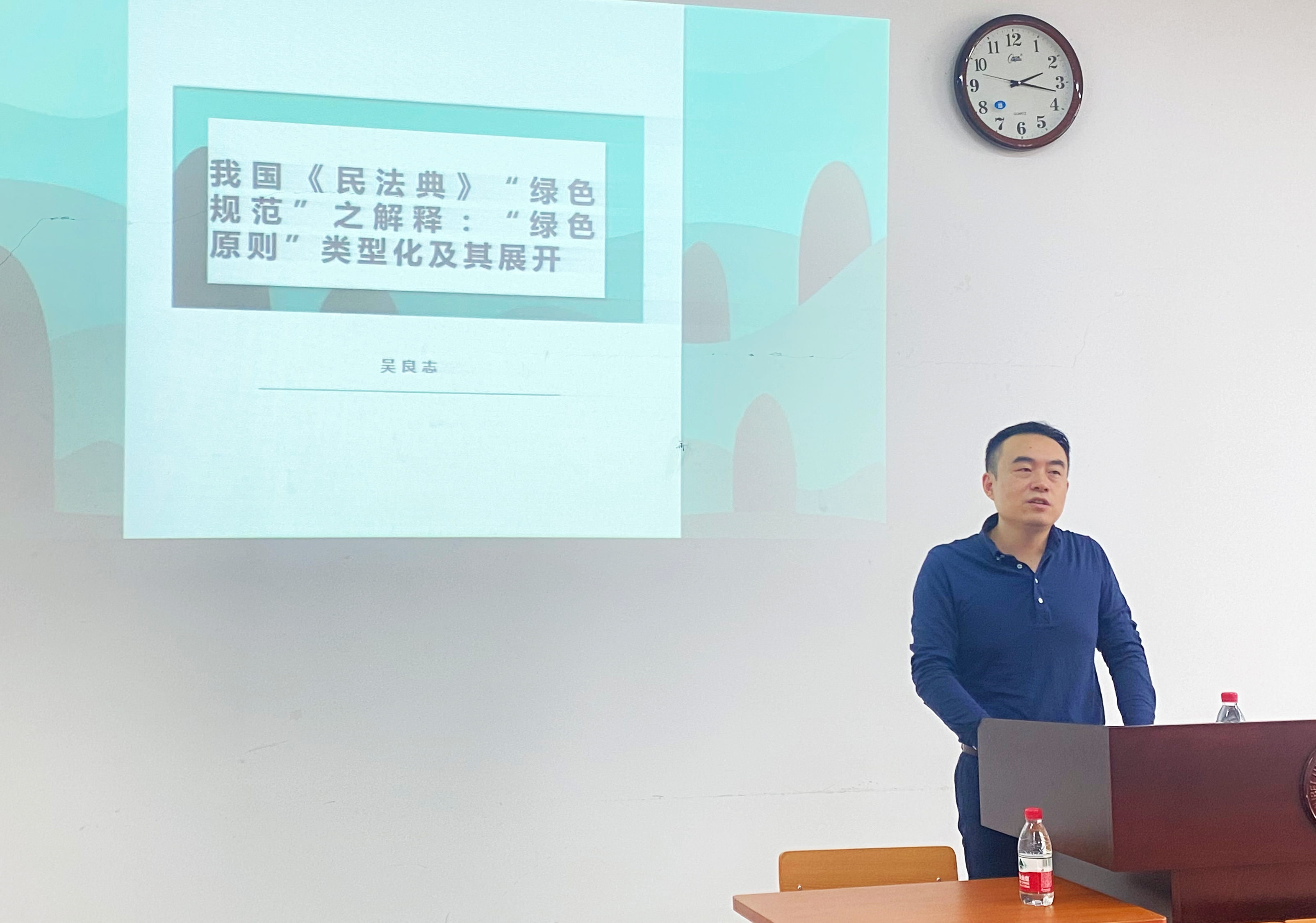 吴良志庭长结合精心准备的展示内容,以“我国《民法典》绿色规范之解释:“绿色原则”类型化及其展开”为题,强调从书本中的法律到行动中的法律,是通过法律解释进行的,以民法典绿色原则为开端,由浅入深,生动阐述了相关理论与司法实践之间的关系,分别为问题和方法、文义解释与伦理解释、绿色原则的类型化及其视角之下绿色规范的解释路径、从“绿色规范”到“绿色裁判规范”的解释与适用这四个方面,内容生动精彩,并结合了现阶段的环境保护法律背景,展示了一堂生动的理论结合实践课,现场的老师同学沉浸其中意犹未尽。