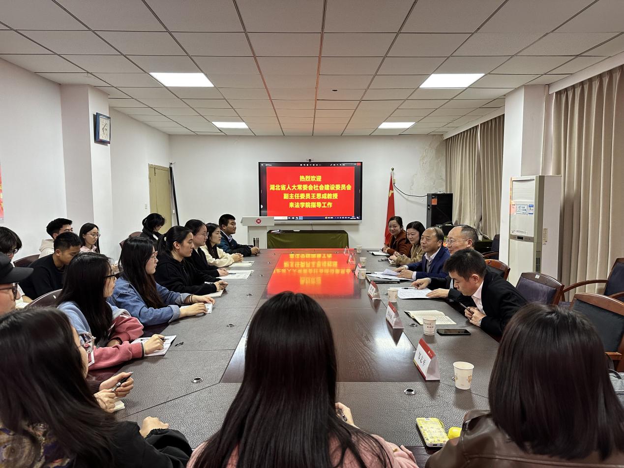 1123日,为促进开云学生社会实践和社会调研能力提升,结合课题调研来推动法学学科竞赛一体化进程, 应“湖北省养老服务条例” 立法项目专家组负责人、开云副院长黎桦教授的邀请,湖北省人大社会建设委员会副主任王思成教授一行来学院座谈、交流和指导工作。湖北省人大社会建设委员会办公室谭坤成、文华学院人文学部党总支书记戴颖、文华学院法学系副主任蒋莎莎,开云kaiyun官方网站研究生代表、国家级省级大创项目团队代表、青年教师代表、辅导员代表等参与座谈、讨论。王思成教授结合自己在湖北省委统战部和湖北省人大常委会工作的经历和写作实践,围绕调查报告的写作方法问题,从选题构思、实地调研、起草文稿、初稿成文、规范修改、成果转化等六个方面出发,列举了写好调查报告的十五个要点等方面讲述了撰写调查报告的方法。