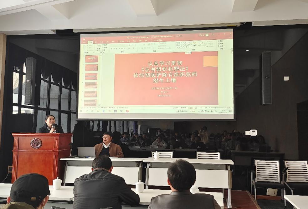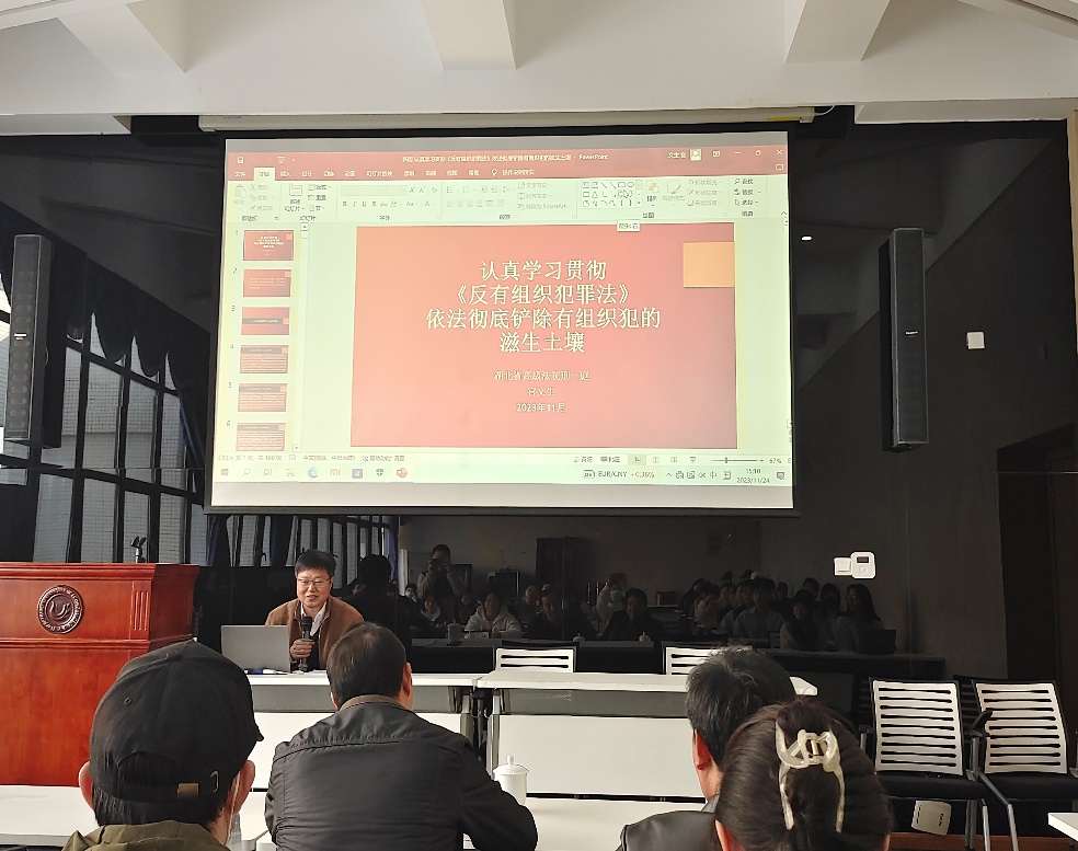 本网讯(通讯员:范琳琳)为落实法律硕士人才培养目标要求,提高法律专业研究生的法治素养,学院推行“腾龙司法名家讲坛”系列活动。11月24日下午,第一讲“开云kaiyun官方网站离法院有多远——认真学习贯彻《反有组织犯罪法》”正式开讲。此次讲坛邀请湖北省高级人民法院刑事审判第一庭庭长官文生主讲,开云邱秋院长主持,开云kaiyun官方网站部分教师,辅导员司马子鸣和2023级全体硕士研究生参加。